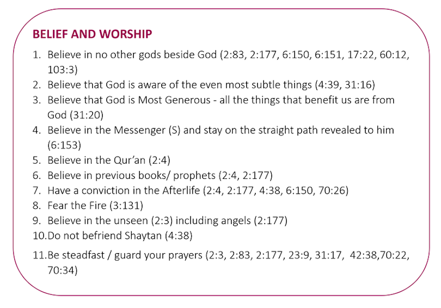 We have seen that there are certain teachings which Allah places great emphasis on in the Qur’an, and repeatedly so, in different ways, through the lips of different sages and prophets. These teachings encompass eternal truths, such as the existence of God, the ongoing journey of the soul after death with its accountability for its conduct in life, and the reality of messengers who exemplified a divine way and exhorted people to it.